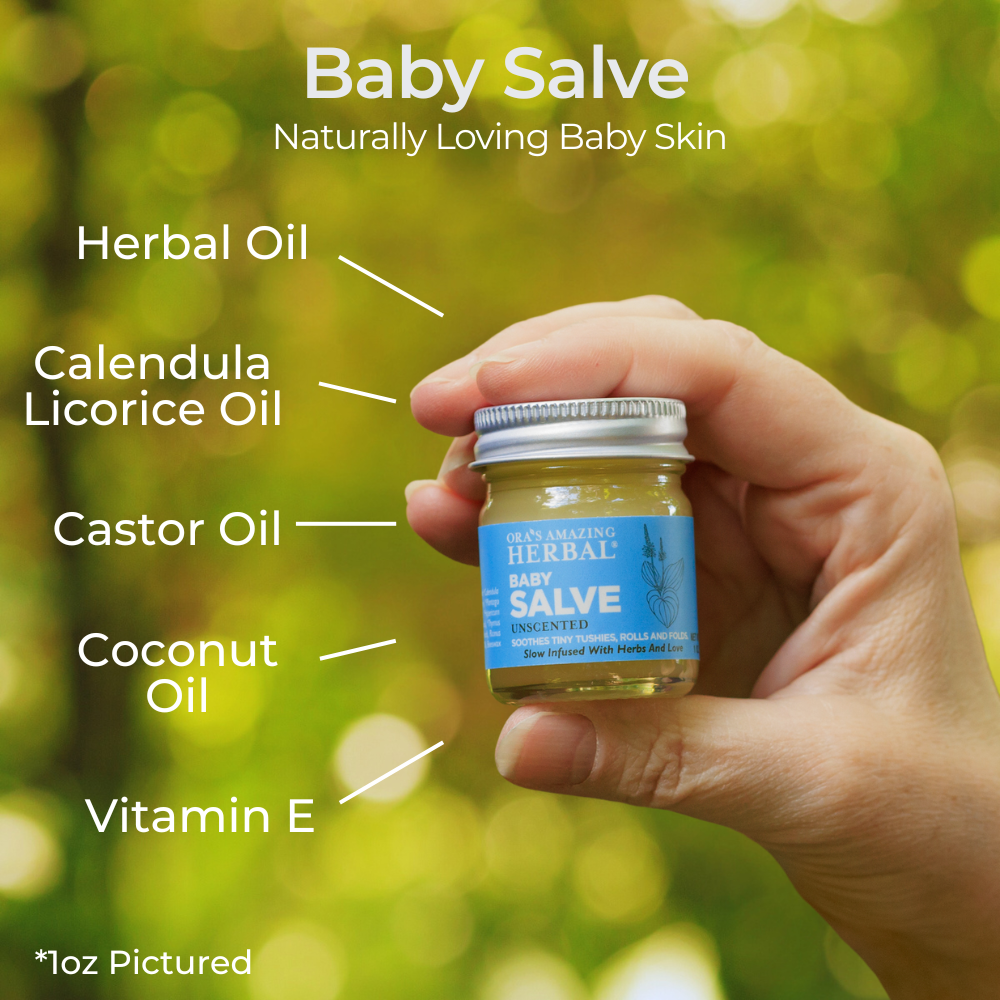 After bath we like to take a few precious baby massage moments with a small amount of salve. We use a clean swab or finger to scoop out a small amount, warm between hands and massage into skin allowing a few minutes for absorption. As a diaper cream we use it in the same way we would any diaper cream. In addition to using as a diaper cream, we avoid overbathing and maintain baby skin health naturally by using a small amount of salve to wipe down areas that tend to collect debris and get irritated. Fat little necks, behind ears and knees, and various rolls and folds can be kept healthy and fresh with an occasional application of a thin layer of Baby Salve. Simply swipe the area with some salve on a clean finger and gently wipe out any excess, leaving a light layer for protection.